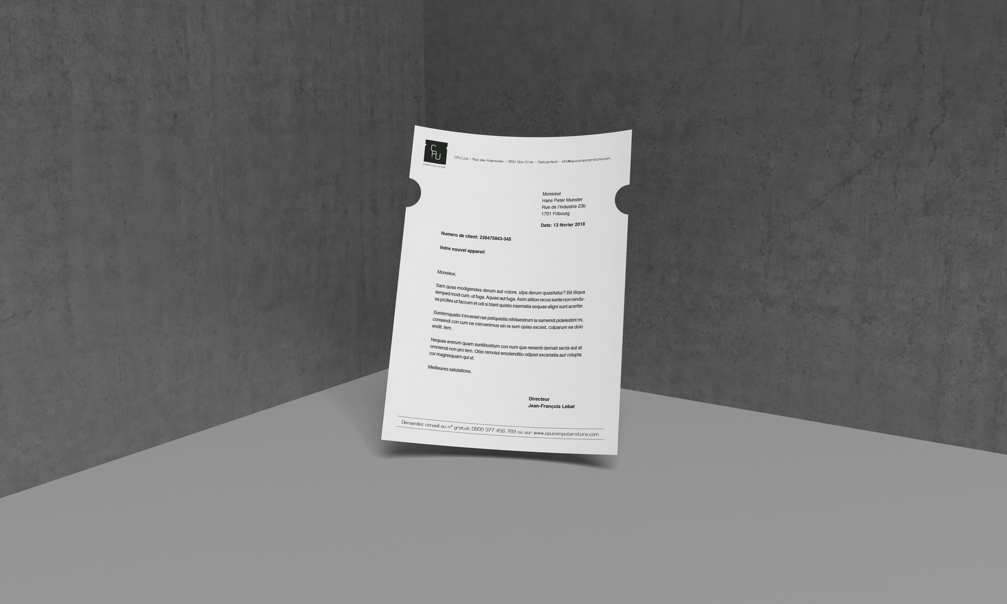 Étape 6 : Lettre commerciale avec des découpes personnalisées qui suivent l’identité graphique.